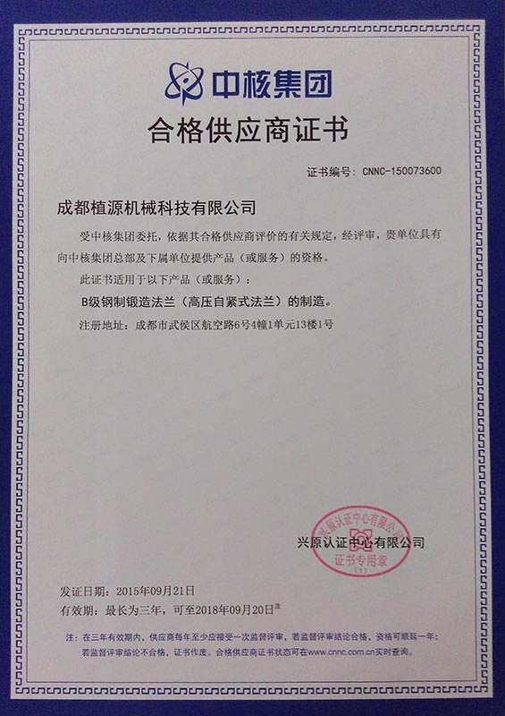 成都植源機械科技有限公司通過(guò)中核集團嚴格的審查、評審,于2015年9月21日獲得中核集團所頒發(fā)的“合格供應商”證書(shū)。